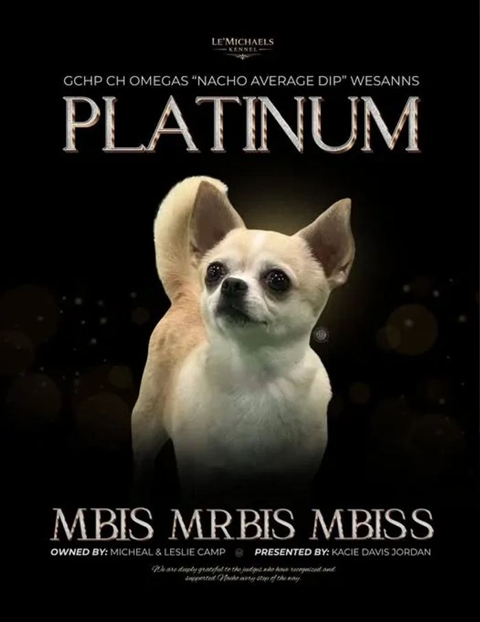 Let's talk about Nacho. He is a once in a lifetime boy. He has gained his Platinum title as a 3yr old, has been the top dog in breed going on 3 yrs. He is happy when he's home and happy to please in the show ring. The cheers and clapping he gets when he is in the show ring just thrill him and make him smile. He has his own FB page and lots of followers. He has well surpassed all of our expectations, and by ours , I mean, me, Tonie, his beloved owners Michael and Leslie Camp of Le'Michael's Chihuahuas, his handler who also loves him Kacie Davis Jordan and her gang at Wesann's Dog Handling, the many Judges that adore him, and lastly his many many followers and supporters who just can't get enough of this little 4lb boy. It just doesn't get any better than this.
